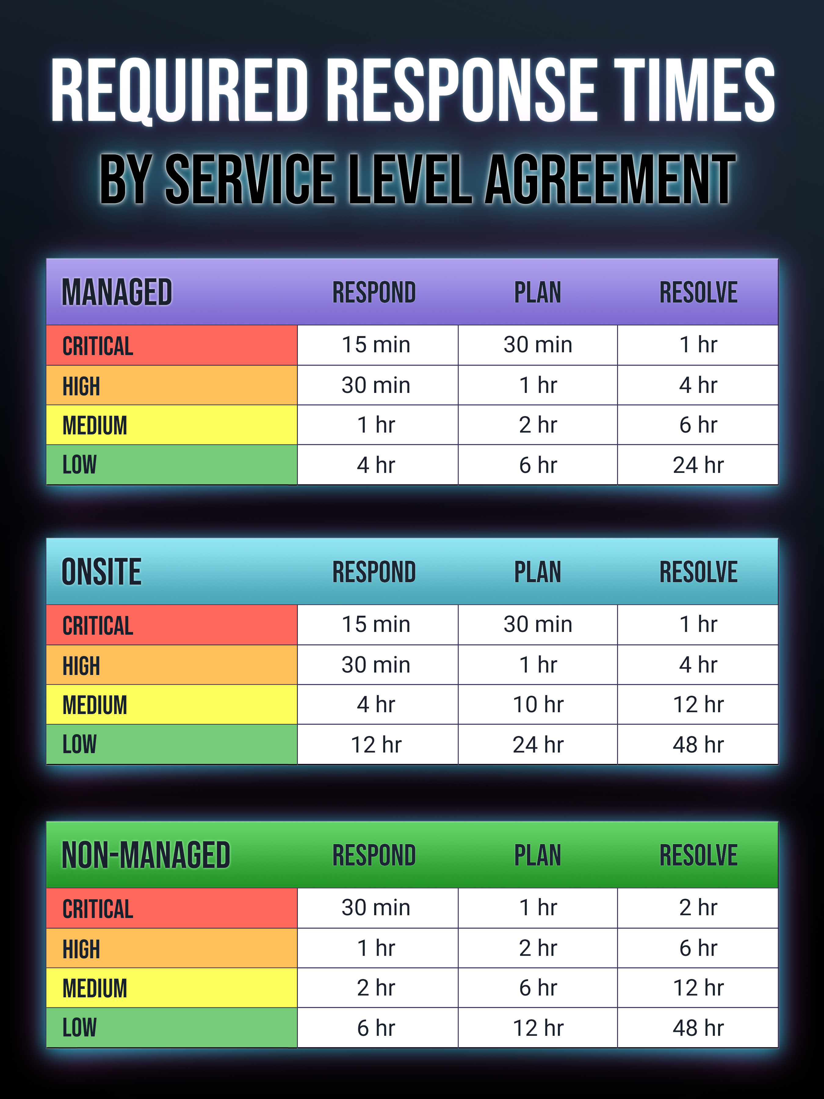ComSolutions maintains standardized response time standards based on your level of service agreement. Click Here for more details. SLAs solution times may not be guaranteed for ships at sea, please contact us for more details.